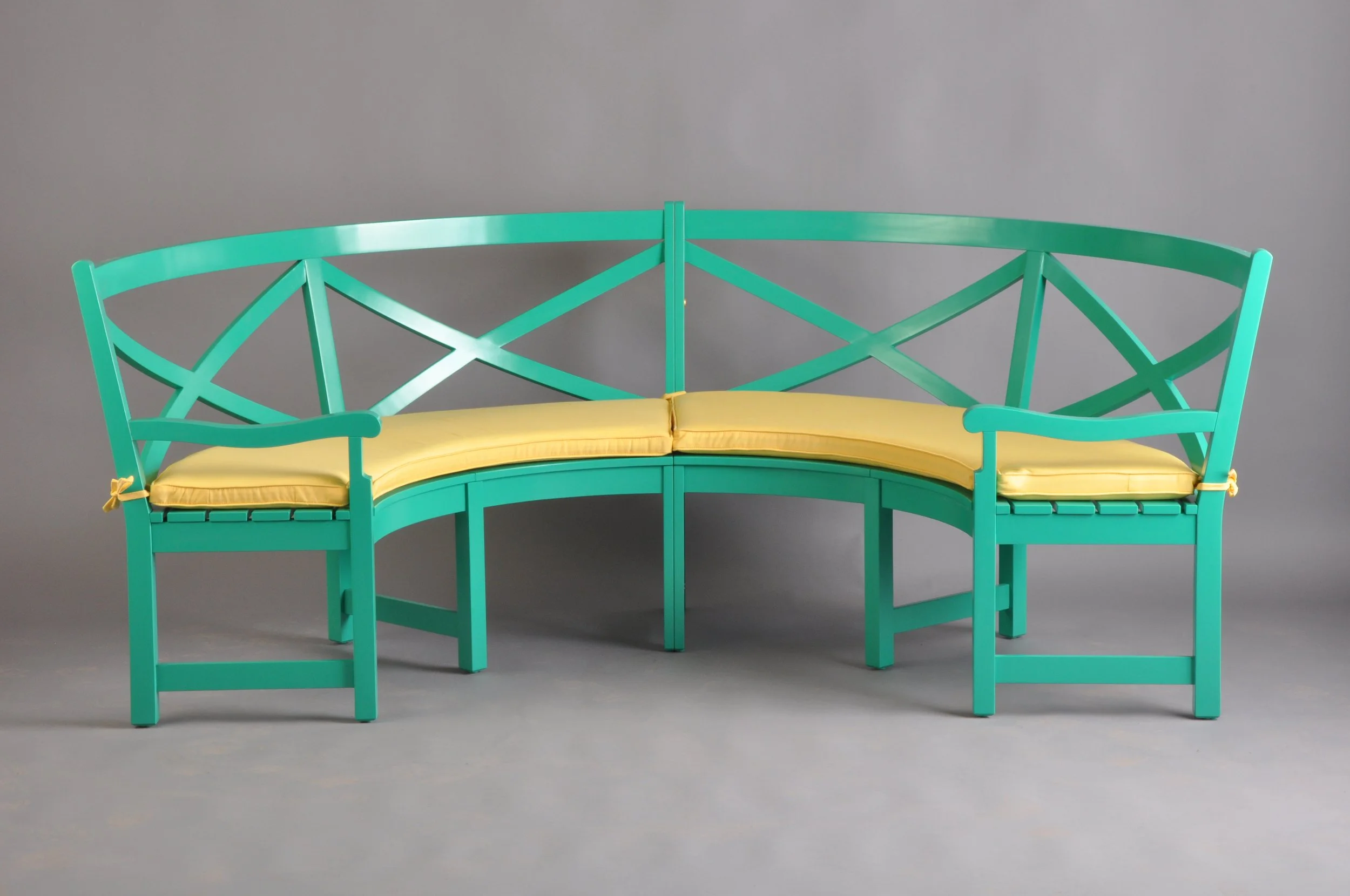Our curved benches are made-to-order and designed to fit your exact specifications. First, we request a radial measurement of your patio or garden space, which we use to determine the curve and overall length of your bench. For optimal strength and durability in curved pieces, we laminate mahogany with marine epoxy and cure it in a vacuum-form, ensuring it will hold its shape over many years of seasonal change. Radius Benches come as quarter-rounds, half-rounds, or any serpentine shape required. Choose between our standard bench styles or work with our design team to translate your particular vision and aesthetic requirements.