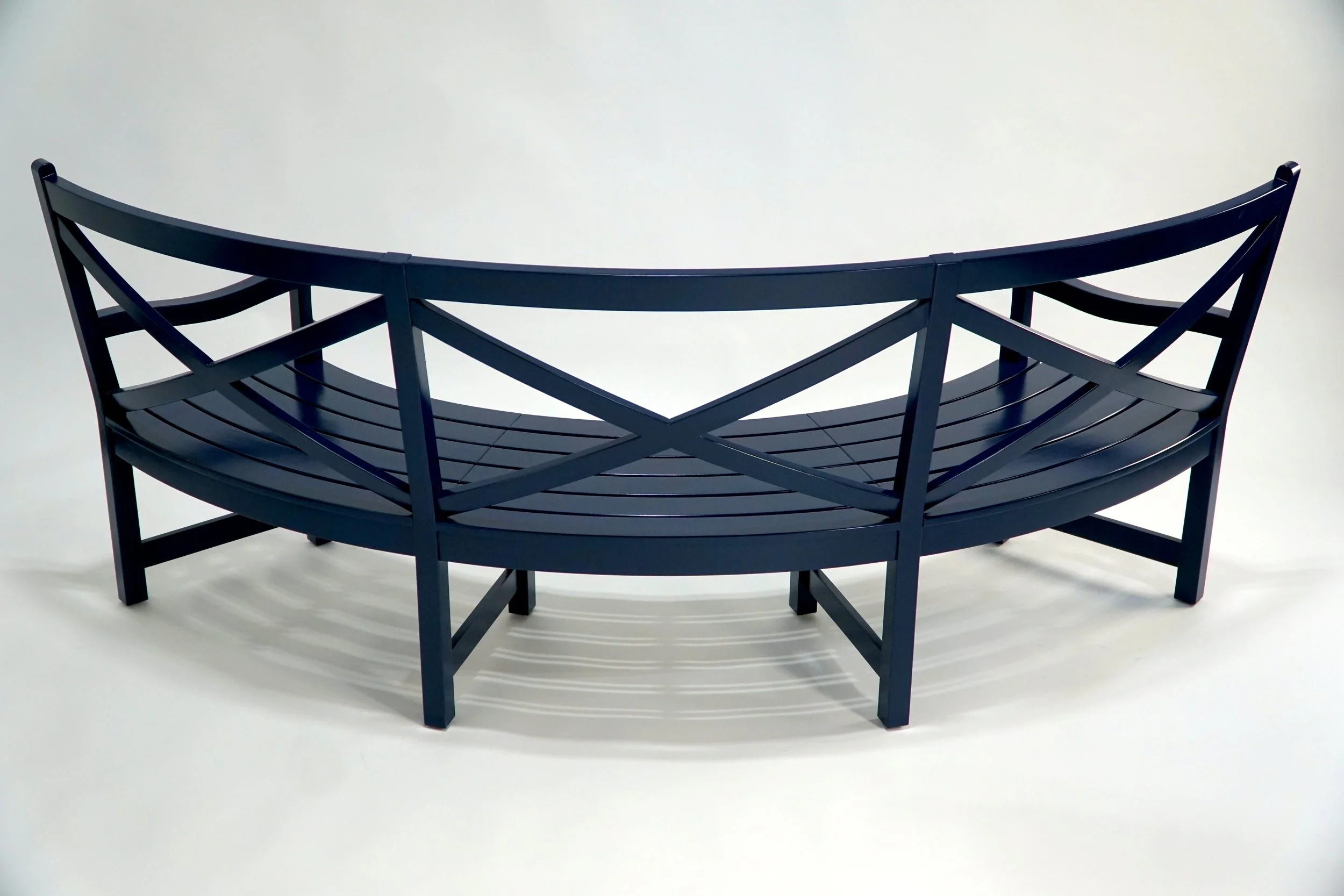 Examples of our curved X Benches, with rounded posts, scrolled arms and flat, straight arms. Shown in half-round, quarter-round, and custom radius iterations.