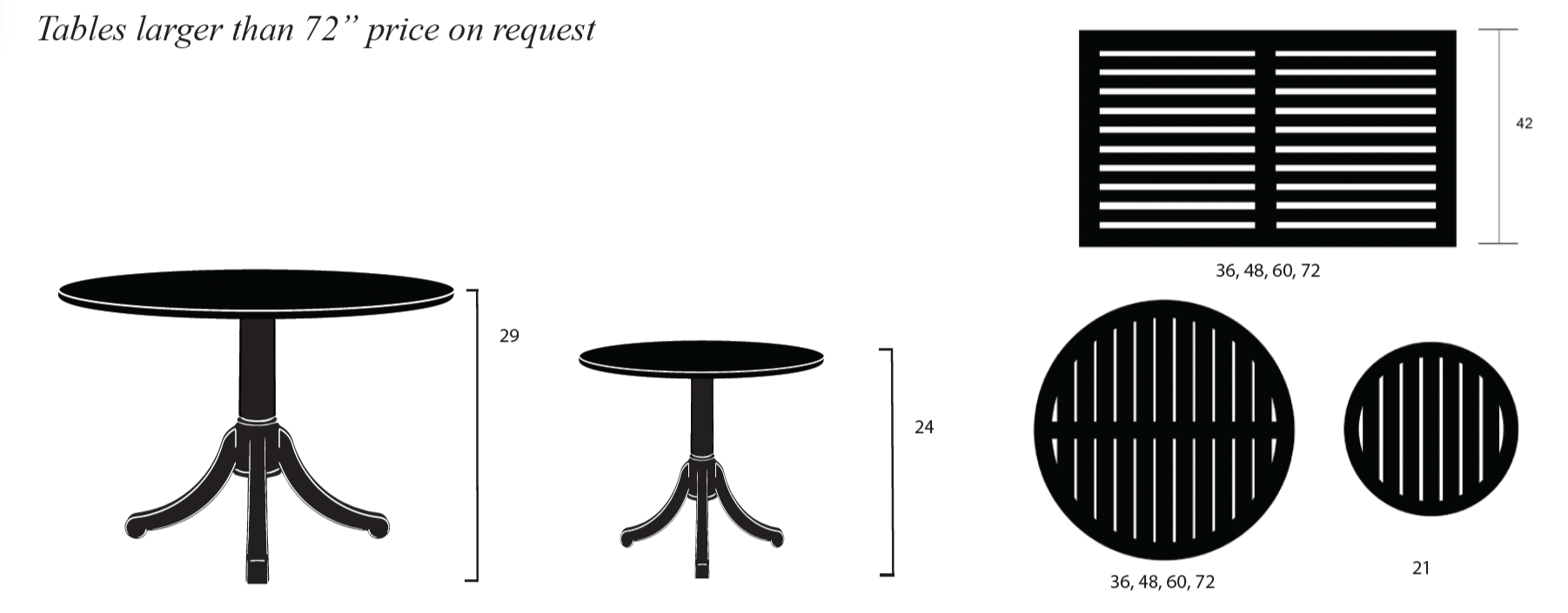 Top Diameter: 36, 48, 60, 72 (Larger sizes on request; double or triple pedestals may be necessary).